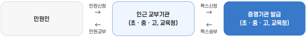 - 신분증을 지참하고 전국 시·도교육청 민원실 및 국·공·사립 초·중·고등학교 행정실을 방문하여 신청서를 작성하시면 팩스로 민원을 신청하 고 3시간이내에 교부받을 수 있습니다.